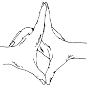 2) Йога для пальцев для наполнения энергией, генерации свежих идей и решения проблем (см.фото). Обе руки помещаем перед солнечным сплетением. Указательные пальцы направлены вверх, а большие вниз, на живот. Остальные пальцы переплетаем. Если Вы выполняете мудру лежа, то можете положить концы больших пальцев на нижний конец грудины. Выполняем 15 минут, можно несколько раз в день.
