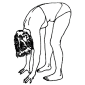Делаем всё так, как на рисунке) Становимся и расставляем стопы на расстояние около 25 сантиметров. Разворачиваем мыски слегка вовнутрь, чтобы немножко потянуть мышцы ягодиц и задней поверхности бедер. Наклоняемся вперед и касаемся пола пальцами обеих рук. Коленки чуточку присогнуты. Весь вес тела должен приходиться на стопы, не переносим его на руки. Расслабляем шею и позволяем голове свободно повиснуть. Дышим ртом свободно и глубоко.