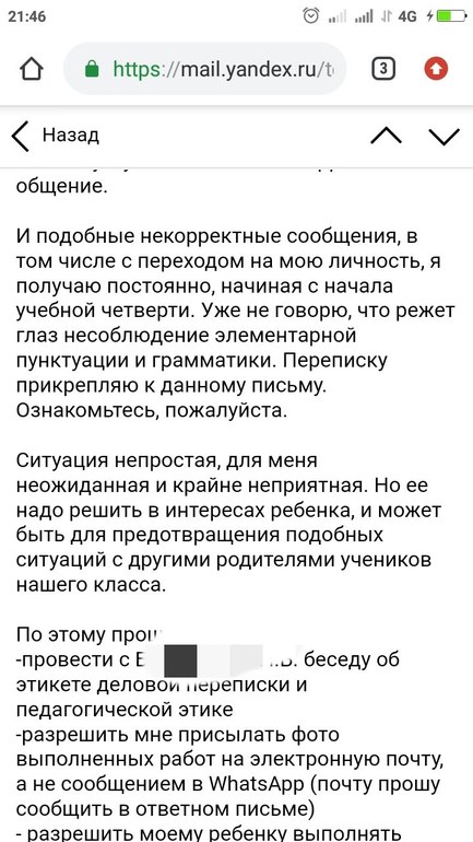 Но вот что обидно, мамы из нашего класса просто воют от требований и от общения. Выкладывали скрины переписок, где учитель может сказать: "мне жаль вашего ребенка", "вы недалекая", "вам все равно на вашего ребенка" и все из-за безобидных вопросов : как решить задачу или какой объем сочинения, почему такая оценка.