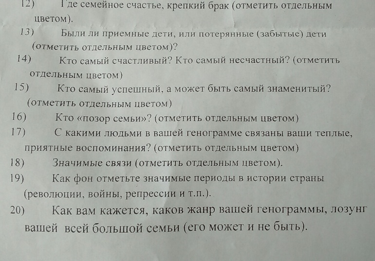 А вы кого писали? Себя, мам/пап, дедушек/бабушек или пра.... тоже? Дядь и тёть не надо ведь? Интересно, кстати. У меня заболевания есть как у многих из нашей семьи и профессия. Остальное вроде бы нет...Вообще все разные и жили в разных условиях. Но так разложить тоже хочу. Если время будет. Вы пост не сносите.