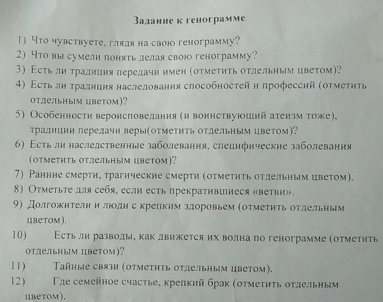 Это не просто генеалогическое древо, которое я составляла тыщу раз (в школе, в универе, для себя). По генограмме можно отследить интересующую тему через поколения (например, разводы, профессии, вероисповедание и т.п.). Обычно берут 3 поколения. После составления отвечают на вопросы. И первый вопрос - что вы чувствуете?