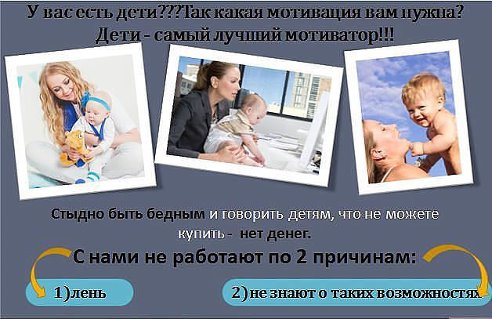 Здравствуйте, мамочки! Предлагаем Вам попробовать себя в должности интернет менеджера крупной международной компании. Мы работаем в 62 странах мира. Все официально, идет стаж, выплаты на банковскую карту, все выплаты! У Вас есть 2 месяца, после регистрации, чтобы понять нужно Вам это или нет. Посмотрите как работают другие. Вдруг понравиться. Если нет, то просто уйдете. Сразу после регистрации, мы будем вмести вести Вас к доходу от 30000руб., и это не предел.