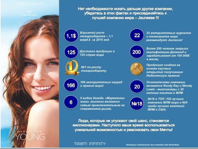 Вам известны признаки шанса? Их два. Первый. Информация о чем-то нужном и важном для вас приходит от незнакомых или малознакомых людей. Второй. Как правило, это не похоже на то, что вы делали до этого. Каким образом изменилась бы ваша жизнь, если бы вы нашли работу своей мечты? Представьте - милое место с гибким графиком... благоприятная рабочая обстановка... возможность карьерного роста и большого заработка... А теперь сравните с тем, что имеете сейчас. Как близко это к тому, чтобы считаться "работой мечты"? Возможно, #бизнес-предложение о сотрудничестве с #Жанесс - это ваш шанс? Шанс изменить свою #жизнь к лучшему, добиться своих целей, осуществить мечту, вырасти как личность, и сохранить свою#молодость с продукцией Жанесс, наконец? Этот результат получили уже тысячи людей, принявших решение о сотрудничестве. Они смогли создать свои организации в международной компании, не делая для этого крупных денежных инвестиций, но получают при этом постоянно растущий доход. Их жизнь изменилась радикально. Став дистрибьютором JeunesseGlobal, вы получите доступ к дистрибьюторским ценам и акциям, возможность не тратить средства из семейного бюджета на приобретение эксклюзивных товаров, а при активной работе - сможете создать международный бизнес, приносящий неприлично приличные деньги, путешествовать в экзотические страны за счет компании