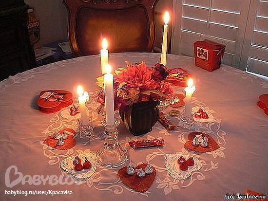 только на полу + лепестки роз в виде дорожки к входу, на сердечках(я думаю салфеточки есть такие) свечки поставить маленькие. эмендемсом выложить что-нить(пока не определилась) романтическая музыка(сейчас выбираю,если есть у кого идею киньте ссыль пожалуйста) из еды - сушы(он их очень любит,а я нет)) соус, мясо по-французки, летний салатик и бутылоска вина.