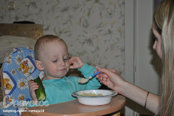 У сынули тоже был праздничный ужин: любимая картошка-пюре, обожаемая котлетка на пару и то, от чего мы сходим с ума - Огурец)))
