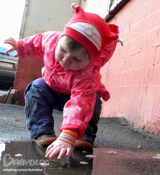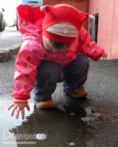 Сонечка присела у лужи и стала трогать эти пузыри пальчиком,