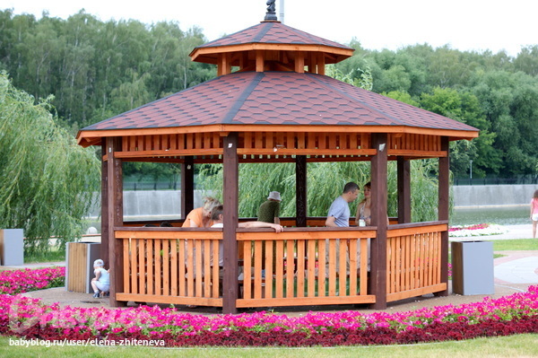 Столько раз были в Кусковском парке и не знали, что он такой огромный. На этот раз мы гуляли в той части парка, которая через дорогу от главного входа. Там велодорожки, детские площадки, беседки и замечательный пруд. Мне понравились беседки, потому что там празднуют дни рождения, там шумно и весело, там шашлыки и веселый смех. Несколько беседок расположены в непосредственной близости к детской площадке, все они были заняты. Взрослые отмечают, дети прыгают по горкам, качаются на качелях, хорошоооо! Да и детская площадка там необычная. Избушка с Емелей на печи.