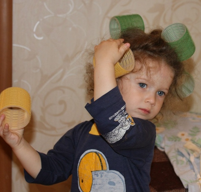 Это она мастерство оттачивает:)) Говорю:"Ника, зачем тебе накручивать волосы? У тебя и так кудри". Отвечает:"Ляля делает, и я тоже буду!" Ляля - это я...