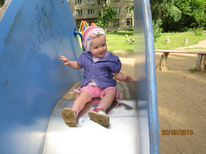 Горка, это самое любимое на площадке)))) Сама ещё не катается, но я держу её за руки и скатываю))) Сколько счастья у неё в этот момент)))))