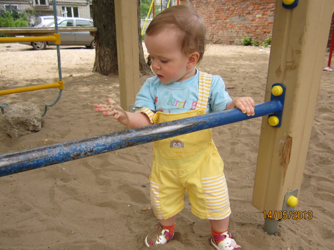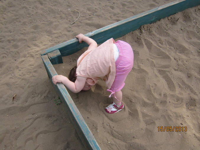 Любит копаться в песке, смотреть, как он сыпится, сейчас пытаюсь отучить её, чтоб не сыпала песок с лопатки по сторонам и не кидала его. Вроде как запомнила, но когда отвлекается, забывает,и опять мотает лопаткой или ведром, и естесственно всё летит в разные стороны. а ещё, песок, очень вкусная вещь))) Не было дня, чтоб она его не пробовала, а потом начинает сама язык вытирать и хныкать, что не приятно, вот ничему её жизнь не учит)))))