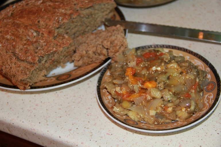 Просто очень вкусный салат из запеченых баклажан,перца,помидор,лука и чеснока,еще кинзы не хватает
