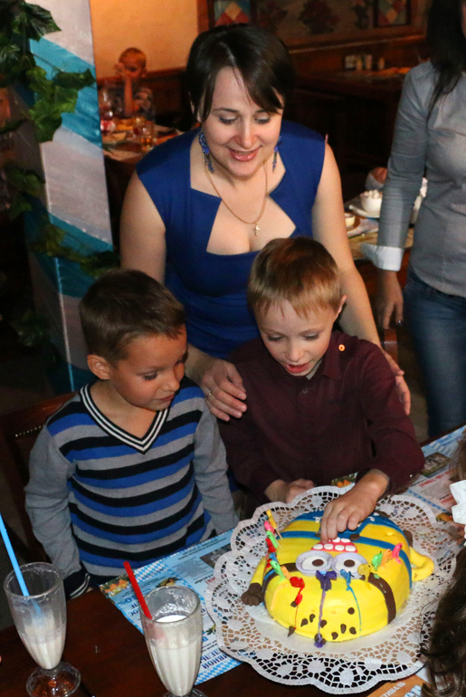 В меню было горячее, сок, молочные коктейли (за счет заведения детям по воскресеньям) и наш торт (его я заказывала накануне, привезли на такси прямо в ресторан) - в виде Миньона из «Гадкого Я» (тоже Матвейкина страсть). Делать торт в виде Дарта Вейдера идея была, но от нее отказались))) Слишком черно)))