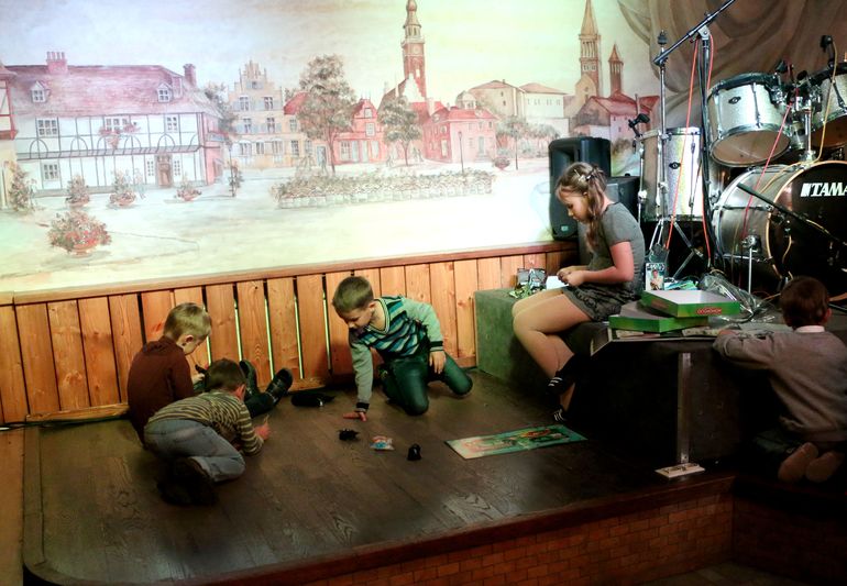 Дети быстро уплели свою еду, потом бегали бесились. Матвей с друзьями разобрал все свои подарки на сцене с окрестром, сидели прямо на полу)))