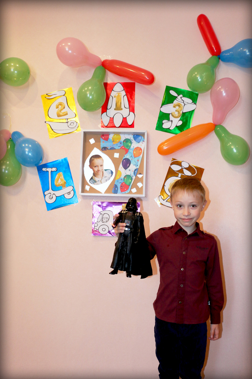 Утром (в 9) Матвей прибежал к нам в спальню, радостно возвестив, что он уже «всё сделал» - заправил постель (что он делает сам редко, приучаем) и «накрыл на стол». В зомби-состоянии мы поплелись в гостиную, где была с вечера украшена стена в честь именинника. А именно - мы долго ждали, пока Лука успокоится, и уже потом, ближе к ночи, надували шары и клеили прочие декорации. (их я делала за несколько дней, т.к. предчувствовала аврал, но всё равно на это было отведено минимум времени) На настоящую стенгазету меня не хватило. Это уже слишком… нереально)))