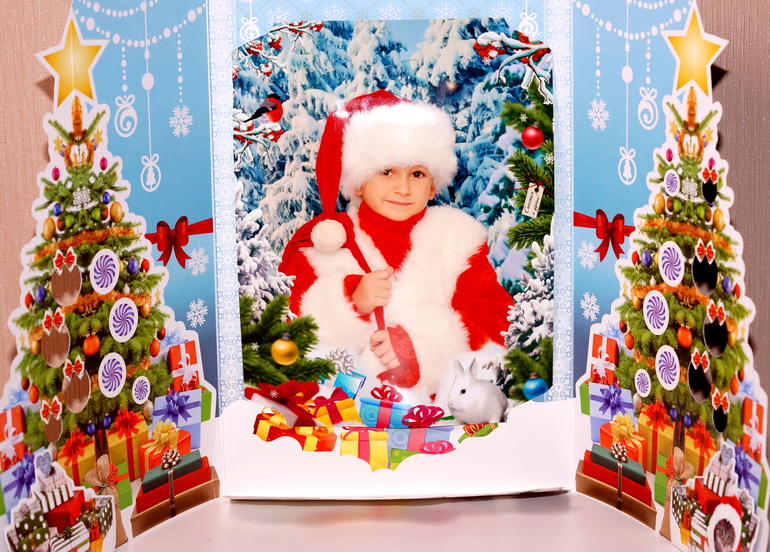 Эти открытки выдали у Никиты в школе. Нам они, конечно, не особо понравились. Я вижу там только фотошоп, папа наш вообще ничего не видит, а сын - "миленького" Деда Мороза. Раз Никите понравились эти фото, значит о возврате и речи быть не может.