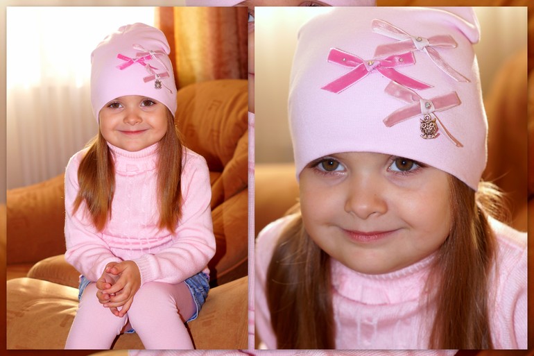 А эту розовую шапочку сделала я. Ну вы можете догадаться по надоевшим бантикам) Я тоже иногда строю из себя рукодельную даму и делаю такие вот глупые розовые бантики.