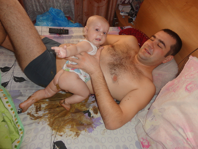 забавные моментыМы с дочкой на кухне готовим завтрак, а попа смотрит за сыном. Тут раздается крик папы: "Мама, спасай!!!!" Забегаю в комнату и вижу ЭТО)))))