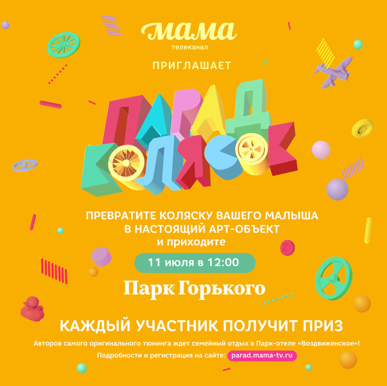11 июля телеканал «МАМА» организует традиционный семейный праздник - костюмированный «Парад Колясок», который состоится на территории центрального парка Москвы (ЦПКиО им.Горького). В этом году «Парад колясок» приурочен к всероссийскому «Дню семьи, любви и верности». Начало праздника в 12:00.