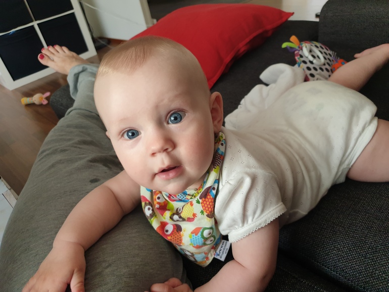 Пробуем ползать. Почти получается. Зубчиков нет еще. Кушаем пюрешки с мясом. И любимую сисю не забываем.