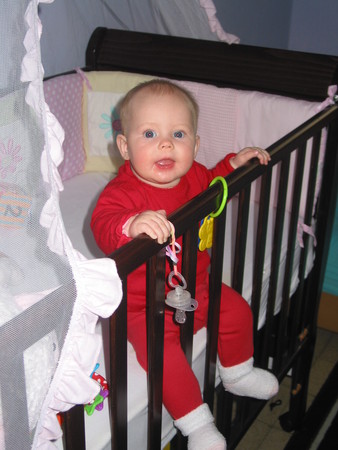 только вы бы донышко кроватки опустили бы на самый нижний уровень. теперь она подтянуться может на ручках и мало ли что...... лучше перестраховаться. у меня доча только попытку сделала такую и мы сразу опустили, а через неделю она встала в кроватке, когда нас в комнате не было, даже подумать страшно, если бы мы не опустили донышко она просто выпала из кровати.