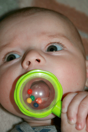 Забавная мордашка) Но еще забавнее, когда Алиса играет с любимой погремушкой, пытаясь ее засунуть в рот)) Но, как говорит бабушка, "рота не хватает")))