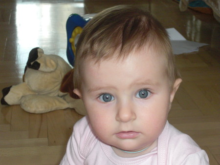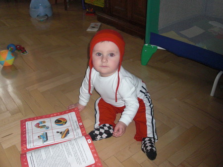 В общем, в свои 10 месяцев Пашенька умеет все то, что "должен" (как пишут в книжках:)))) Ползает по всей квартире - со скоростью света,наш папа называет это - "тараканьи бега"))) Встает на ножки и ходит вдоль стенки или дивана, самостоятельно пока не желает...Говорит - "мама", "папа", "баба", "дядя", тятя" "няня" и складывая эти слоги разговаривает - радует нас долгим монологами)))