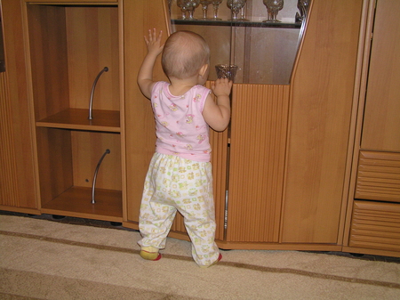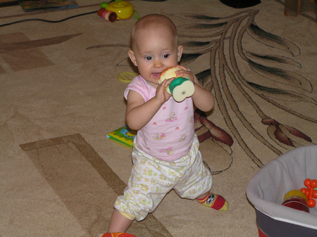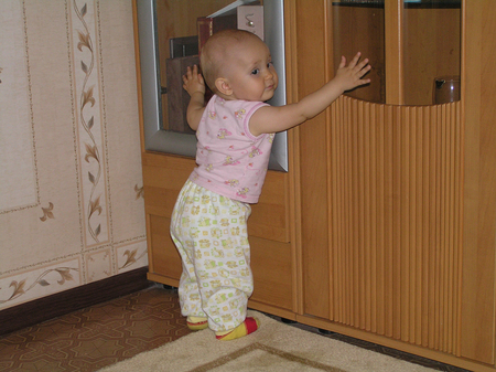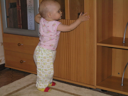 Научились стоять без поддержки очень долго. Может встать даже посередине зала и стоять. А на нашей кровати даже прыгает без поддержки, но не долго. Когда долго стоит, ноги почему-то разъезжаются в разные стороны почти до шпагата, но видно так задумано: