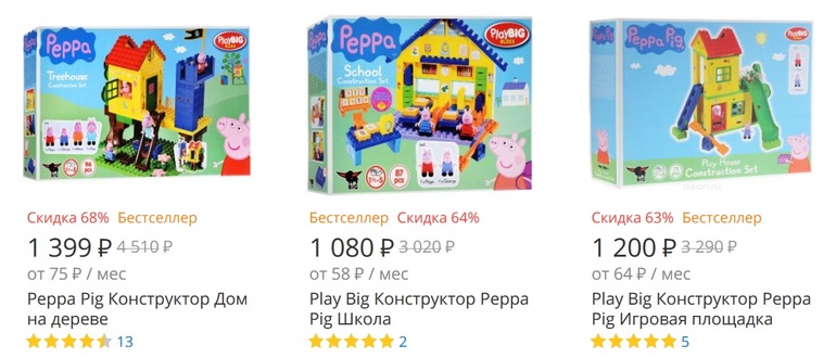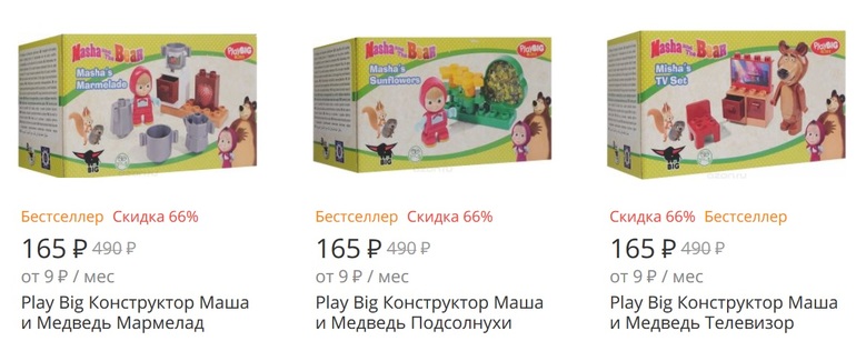 Сейчас конструкторы Маша и Медведь, а также большие наборы конструкторов Свинка Пеппа (Pig Peppa) можно купить очень дешево. А также множество настольных игр и игрушек
