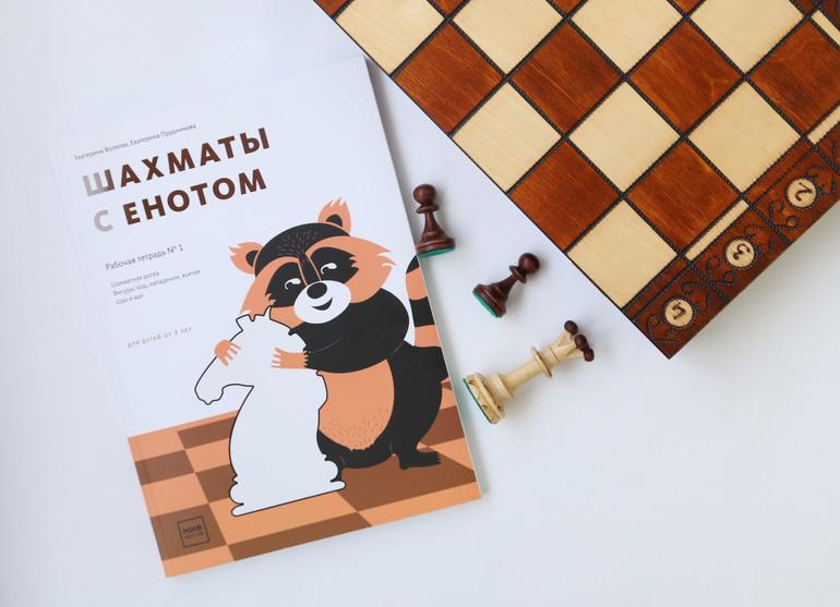 А что касается шахмат, то я купила вот такое пособие, которое мелькало у меня в ленте. Честно скажу, при чем тут енот я не знаю, по тексту он никак не задействован, только на картинках есть.