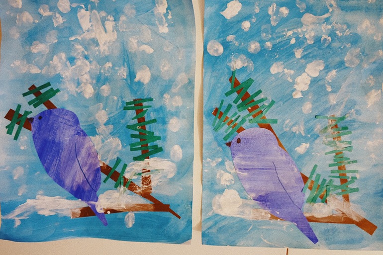 здесь фон делали на мокрой акварельной бумаги синие и белые мазки кисточкой. Пингвинов делали штампами из картофеля, снежок скомканной салфеткой.