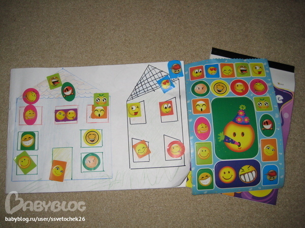 А это мы нарисовали домики, раскрасили их, а потом в окошки " расселили жильцов " (клеили наклейки), когда окошек не осталось клеили дуда попало))