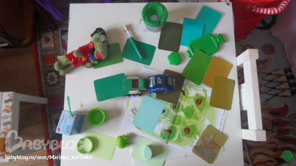 Раз лягушки зеленые, то вспоминали оттенки зеленого из . ну заодно определили оттенки вещей, попавших под руку)))