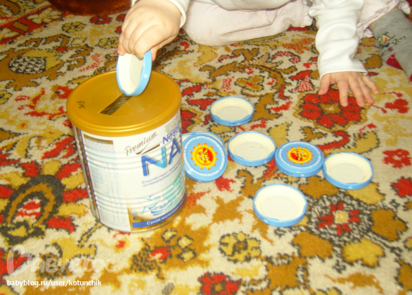Пытаются просовывать в дырочку, но пока не очень получается, так что мы пока без крышки складываем в банку крышечки, высыпаем и снова складываем,гремим!