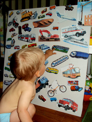 а мы просто фото разного транспорта накачали и показываем.по компу....но он уже всё выучил...