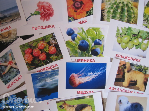 Развитие детей второго года жизниМы с сынулей уважаем карточки Домана, но купленные комплекты уже засмотренны до дыр, а Интернет ничего нового для скачивания не предлагает. И вот меня озарило сделать карточки самой, в обычном Word`е - час - и готово несколько наборов: "Породы собак", "Цветы", "Ягоды", "Морские обитатели". Зацените: