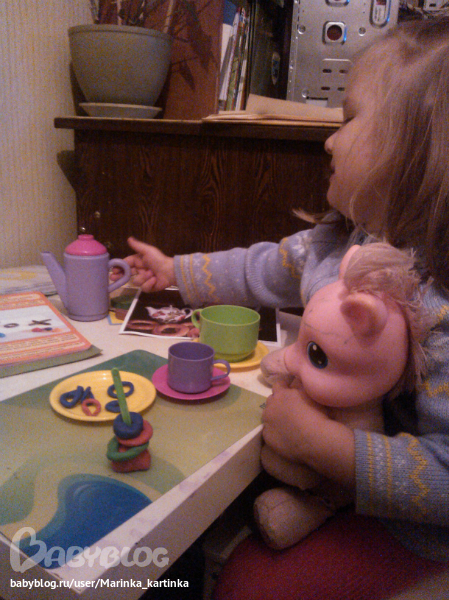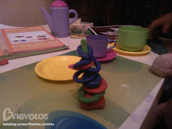 Вот полепили их, сделали пирамидку из колечек и счетной палочки и напоили игрушек сладким чаем с самоделными баранками)))