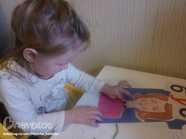 Петеом перешли к творчеству. Помогали тете собраться в театр. Заодно обсудили какие бывают бусы: длинные-короткие, круглые-квадратные, большие-маленькие...Работали с заготовкой из третьего выпуска :
