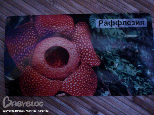 А тут нашла на карте цветок - под номером 23 и спрашивает нас. А я так гордо отвечаю - это раффлензия! У нашего папы чусть челюсть не отвалилась) А я еще в догонку - это самый большой цветок на земле! Откуда знаю? Дочуркины карточки просвятили)))