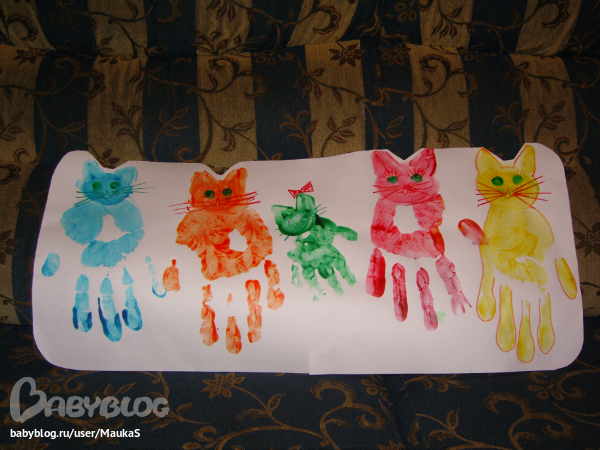 Когда всех сделали - пошли знакомить подружек (прилепляли кошек-лепешек на плакат с ладошками - он у нас гордо висит на стене!!)