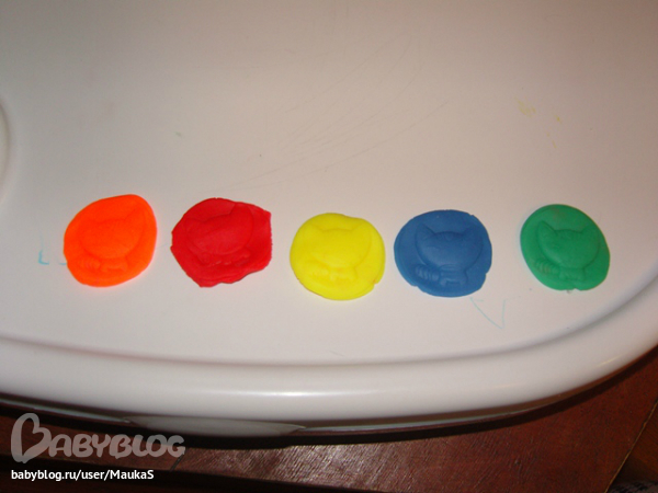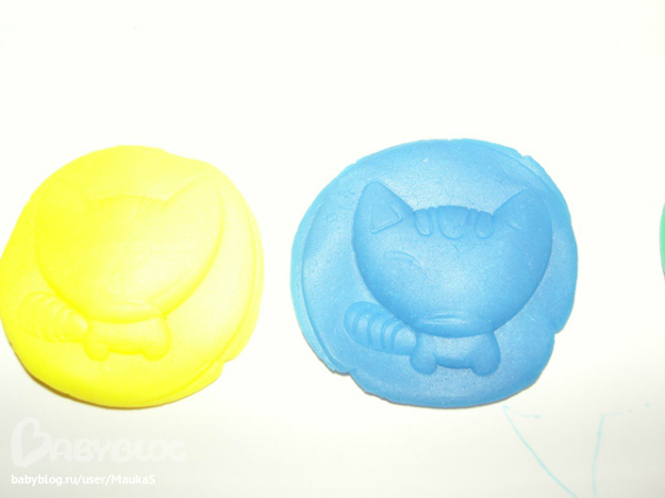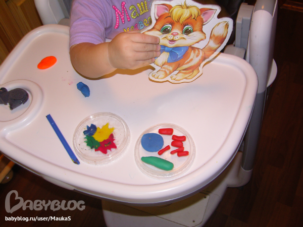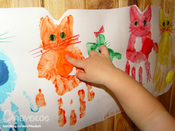 догадалась, что это она самая и есть)))) И идея пришла такая - для закрепления цветов - решили мы каждой кошке-ладошке, слепить кошку - лепешку) Катали колобок, делали лепешку, а на нем отпечаток кошки.