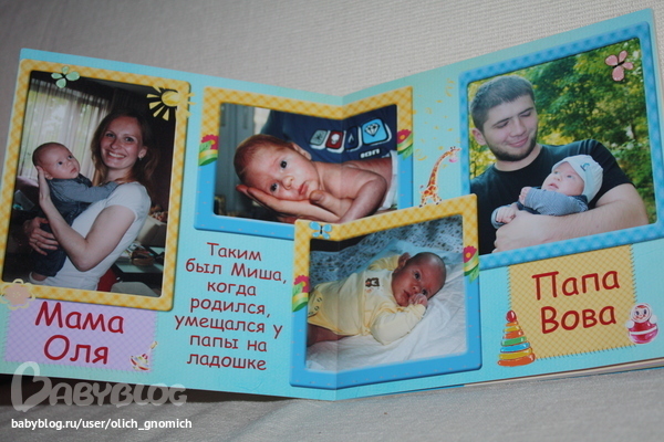 Сделали мы ее давно, но до сих пор ее он может смотреть и изучать самое продолжительное время!)) Делали мы причем две книжки. Одну большую, про весь мишкин первый год. Ее мы смотрим только с мамой или папой. А эта маленькая, картонная и недорогая была сразу отдана "на откуп" малышу) И вот уже столько времени она живет целая и невредимая.