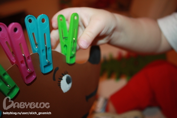 Все о развивающих игрушках, пособиях и книгах (обзоры, рекомендации,хвастики, ссылки)Мишка сегодня познакомился с прищепками) ОХ, как же ему тяжело было с ними совладать! И так главное сильно сжимает их ручками, правда с другой стороны)))
