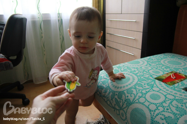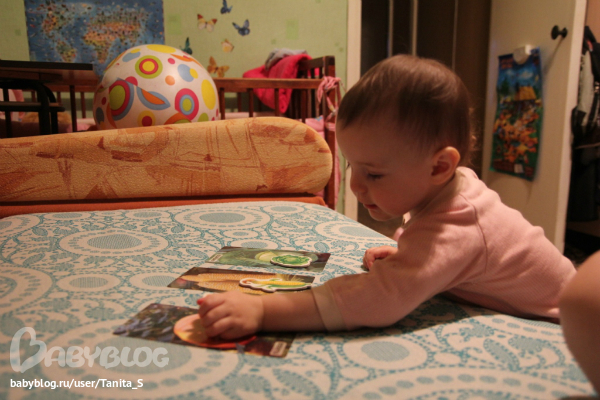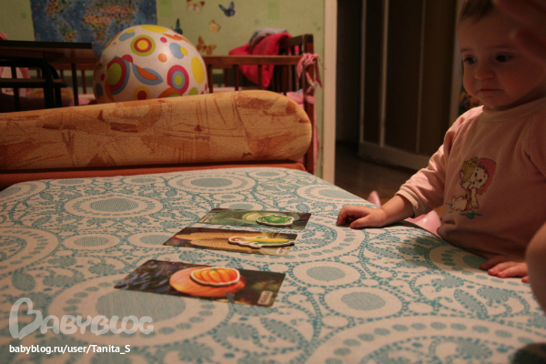 На фотках первый день, когда мы так начали играть: утром играли сами, вечером показывали папе. Может быть, не сильно видно, что она выбирает магнитом нужную карточку, но это так, не промахивается!)))