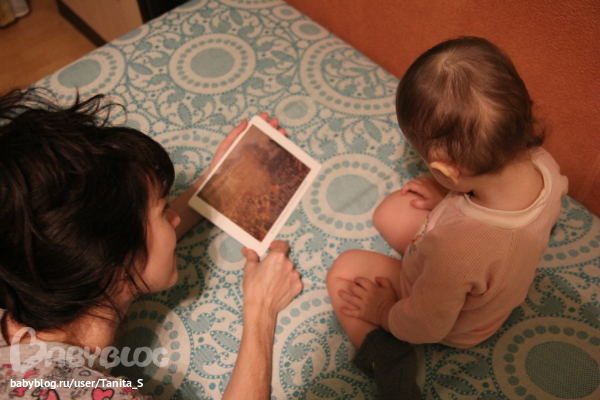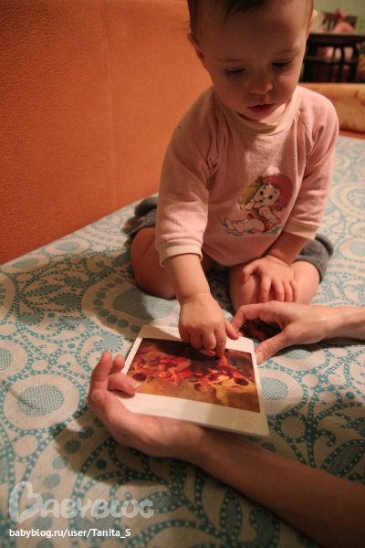 Это пособие, в первую очередь, находка для меня. Оооочень оно мне нравится, и Веруша с ним тоже уже подружилась. Мы любим рассматривать подолгу карточки из него, тыкать пальчиком в полюбившихся героев. Так нам понравилась картина Валентина Серова «Октябрь. Домотканово», Веруша тыкала пальчиком на мальчика-пастушка и на лошадок, говоря при этом «мууу»))) Мои поправки, что это лошадки, а коровки на картине дальше изображены, помогли не сразу. Когда смотрели натюрморты, дочура все кормила меня яблочками и виноградом. Еще Вера может репродукции расставлять вдоль стен, дивана, создавать свою галерею тем самым.