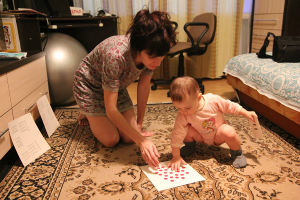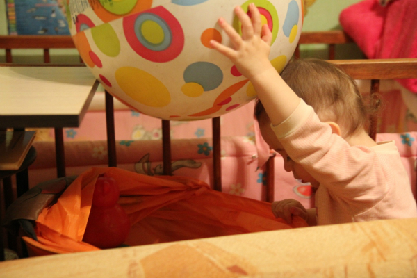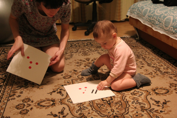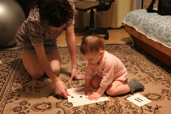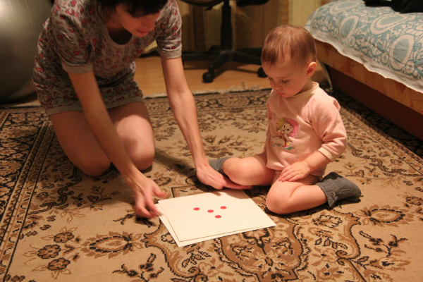 Веруша сейчас все чаще требует новые и новые игры с карточками. То ли я ее разбаловала различными формами показа, а скорее она же просто ребенок))) Вот я и придумываю новые и новые игры-формы показа. Ладно всегда под рукой есть, там можно подглядеть, если с фантазией становится туго. Так количества по мы смотрим, сбивая их мячом. Вере нравится этот процесс. Она прям со всего маху толкает мяч в карточку, она падает. Я озвучиваю количество на упавшей карточке. Только я начала расставлять карточки, как Веруша побежала искать в корзине мяч.