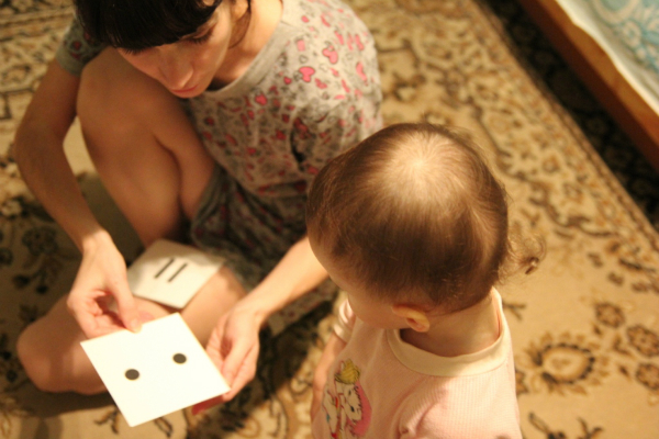 Я складывала перед ней количества, а Вера складывала знаки. Получилось весьма продуктивно. Я кладу карточку с количеством «двадцать четыре», проговариваю его, говорю Вере, чтобы она положила карточку «разделить», она послушно выполняет мою просьбу, дальше я: «на шесть» — карточка с шестью точками, Вера: «равно», я: «четырем» — карточка с количеством 4.