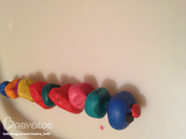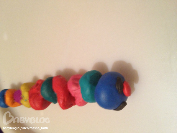 Это гусеничка, шарики пытался катать сам, насаживал на палочку практически сам, глаза и рот лепил сам, я только кусочки оторвала.