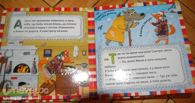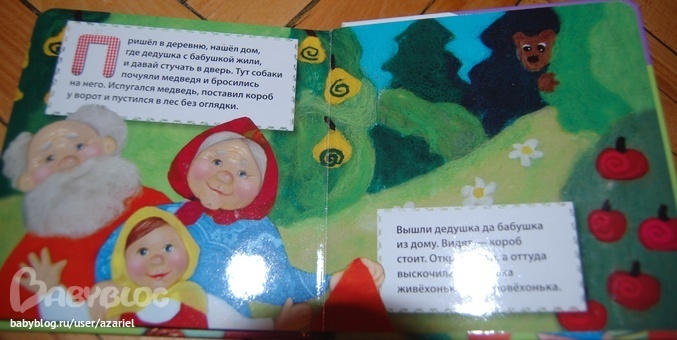 Иллюстрации кукольные, очень необычные, продуманы до мелочей. Единственное страницы тонкие, поэтому читают только взрослые. Всего 10 сказок (репка, яичко, колобок, теремок, сестричка Аленушка и братец Иванушка, лиса и дрозд, лисичка-сестричка и волк, волк и коза, Морозко, лиса и заяц) и вступительная статья о "Лесном человеке". Шрифт в книге крупный.