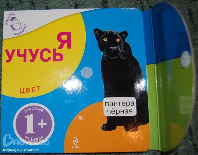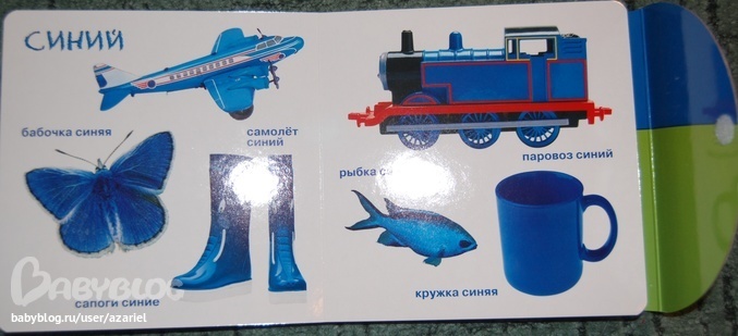 Я учусь. Цвет. Очень плотный картон, яркие цвета, приятные, реалистичные иллюстрации, а еще обложка на липучке. На каждом развороте, предметы одного цвета и все они подписаны. На последнем развороте предметы разных цветов, без подписей.