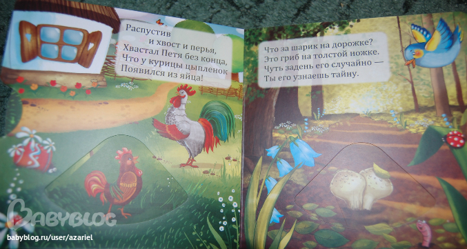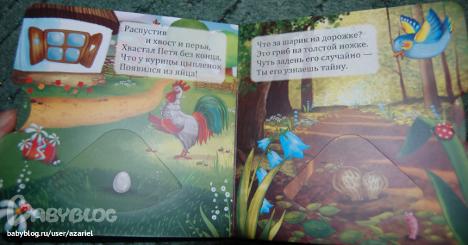Очень мне понравилась эта книга. С ее помощью можно объяснять последовательность, развитие от яйца к цыпленку, потом к петушку и до петуха. Малышу самому интересно крутить колесико, заодно тренирует мелкую моторику. Книга подойдет малышам и даже дошкольникам.